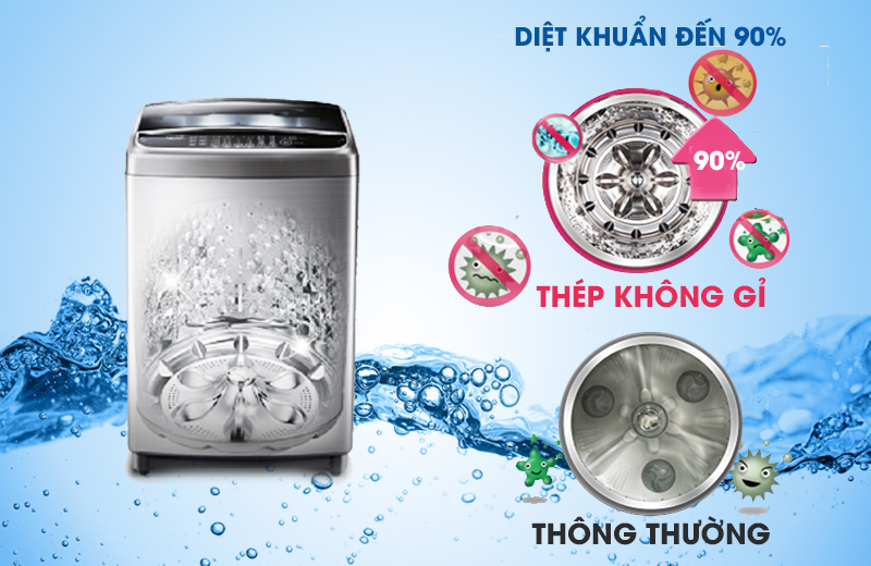 Với thiết kế lồng giặt theo dạng lồng đứng quen thuộc, bạn hoàn toàn dễ dàng cho quần áo vào và lấy quần áo ra một cách đơn giản. Trên hết, lồng giặt còn được làm từ thép không gỉ, sẽ giúp tiêu diệt lên đến 90% vi khuẩn gây hại cho gia đình bạn.