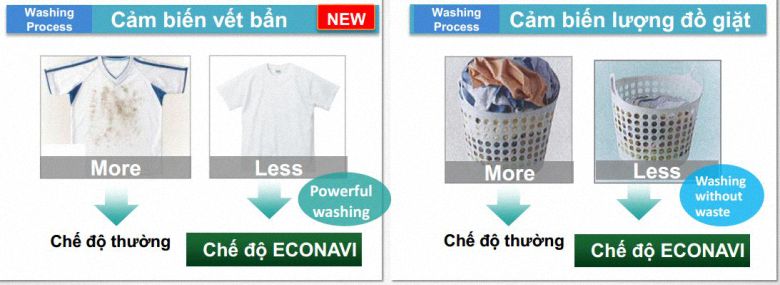 + Cảm biến Econavi: Máy sẽ tự động cảm nhận và cân chỉnh mực nước cần thiết tương ứng với số áo quần được cho vào lồng giặt giúp tiết kiệm hiệu quả nguồn năng lượng tiêu thụ. Ngoài ra, cảm biến Econavi còn có khả năng cảm biến nhiệt độ nước, giúp điều chỉnh thời gian giặt nhanh hay chậm tùy vào nhiệt độ nước sử dụng.