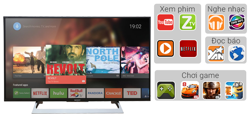 Trên chiếc Android tivi Sony này, bạn có thể kết nối mạng cho tivi và sử dụng hàng trăm ứng dụng thú vị từ kho Google Play. Chẳng hạn, bạn có thể đọc báo bằng trình duyệt web; xem phim trên YouTube, Zing TV hay FPT Play; nghe nhạc trên Zing Mp3 hay Google Play Music… Đặc biệt, SMART TIVI SONY có kho game cực kì ấn tượng với nhiều game được yêu thích như: Asphalt 8, Modern Combat, The Walking Dead, Final Fantasy, The King Of Fighters, Despicable me…