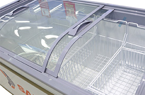 Tủ đông được thiết kế với hai kính lùa cong rất dễ quan sát, với nhiều giá treo đồ giúp khách hàng có thể trưng bày được nhiều loại sản phẩm hơn.