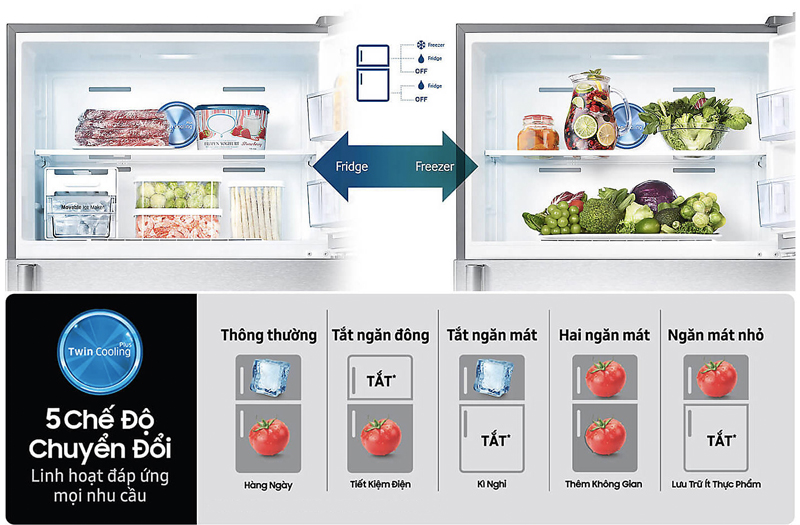 Với công nghệ 2 dàn lạnh độc lập duy nhất, chỉ có tủ lạnh Samsung cho phép người dùng linh hoạt sử dụng một trong 5 chế độ tùy theo nhu cầu. Chuyển đổi ngăn đông thành ngăn mát thêm không gian lưu trữ (chế độ Hai ngăn mát) hoặc tắt hẳn một trong hai ngăn để tiết kiệm điện năng khi không có nhu cầu sử dụng (chế độ Tiết kiệm điện, Du lịch, Ngăn mát nhỏ).